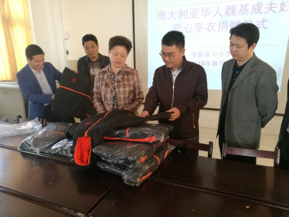 集團公司扶貧幫扶村壽縣安豐鎮(zhèn)甲貝村是重點貧困村,安豐小學位于安豐鎮(zhèn)甲貝村境內(nèi),在校學生2025人,貧困學生113人。安豐鎮(zhèn)黨委政府和集團公司駐村工作隊重視僑界資源,積極與市縣僑聯(lián)對接。2018年,在市僑聯(lián)的關(guān)心幫助下,爭取到澳大利亞籍華人魏基成夫婦基金會捐贈愛心冬衣192件,價值3萬余元。
