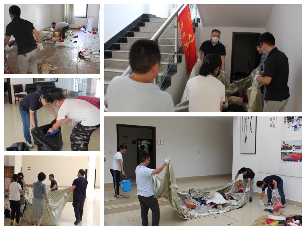 此次“黨員活動日”黨員們組織開展酒店附屬設(shè)施的集中清理整頓,對有關(guān)單位移交的辦公樓進行全面清理,為酒店建設(shè)人員現(xiàn)場辦公提供條件。經(jīng)過簡單籌劃安排,各黨支部黨員、預備黨員、發(fā)展對象和入黨積極分子們結(jié)成臨時工作小組,實行任務(wù)包干,對辦公房、樓梯間、食堂及大廳區(qū)域進行全面整理,在面對體量大、難度高的“硬骨頭”時,黨員們更是大力發(fā)揮出了突擊隊的沖鋒精神,搶在前干在前,揮汗如雨、不怕臟累,經(jīng)過近一個上午的集中攻堅,累計整理出20余間工作間,清理的垃圾雜物堆如小山。