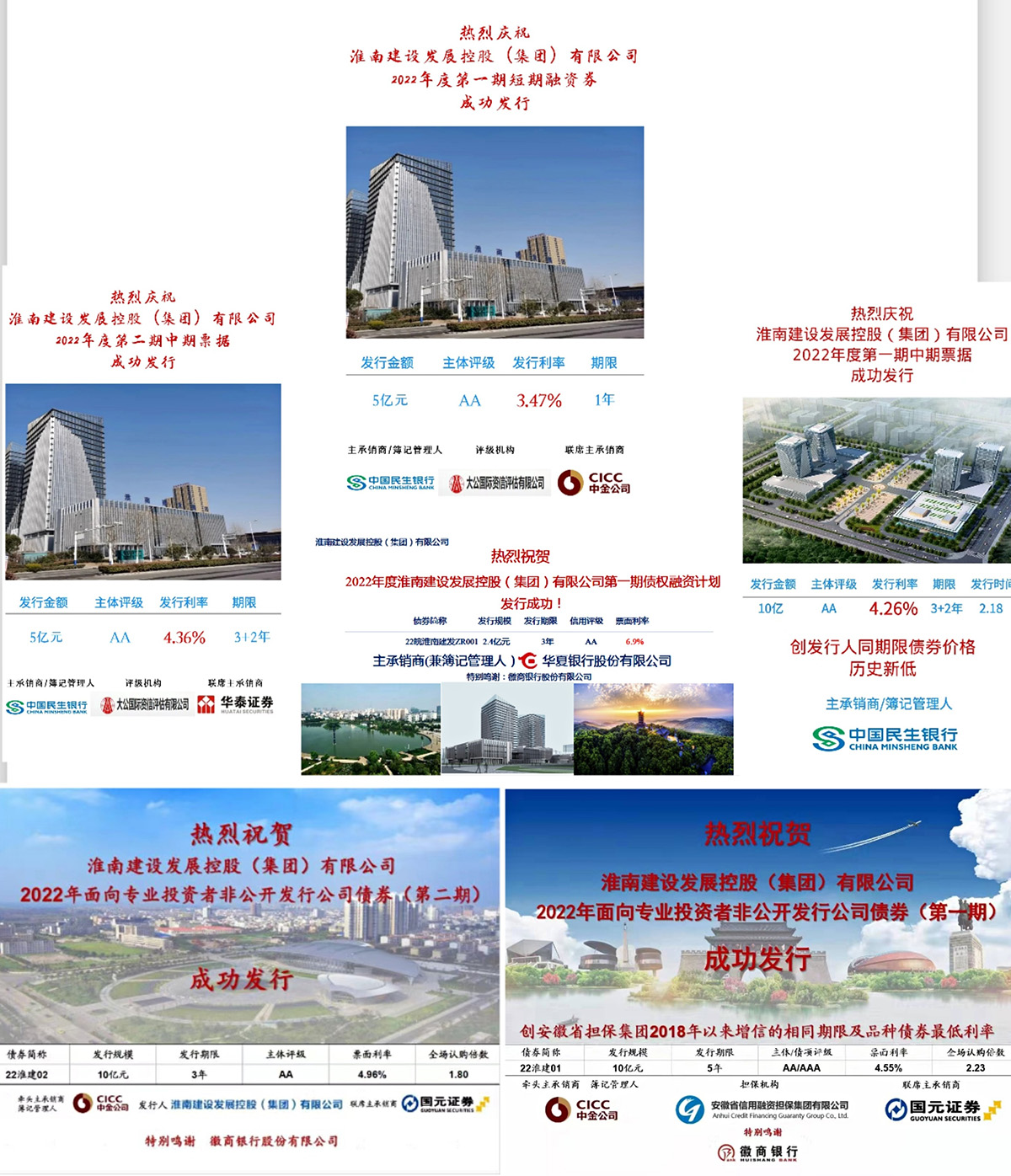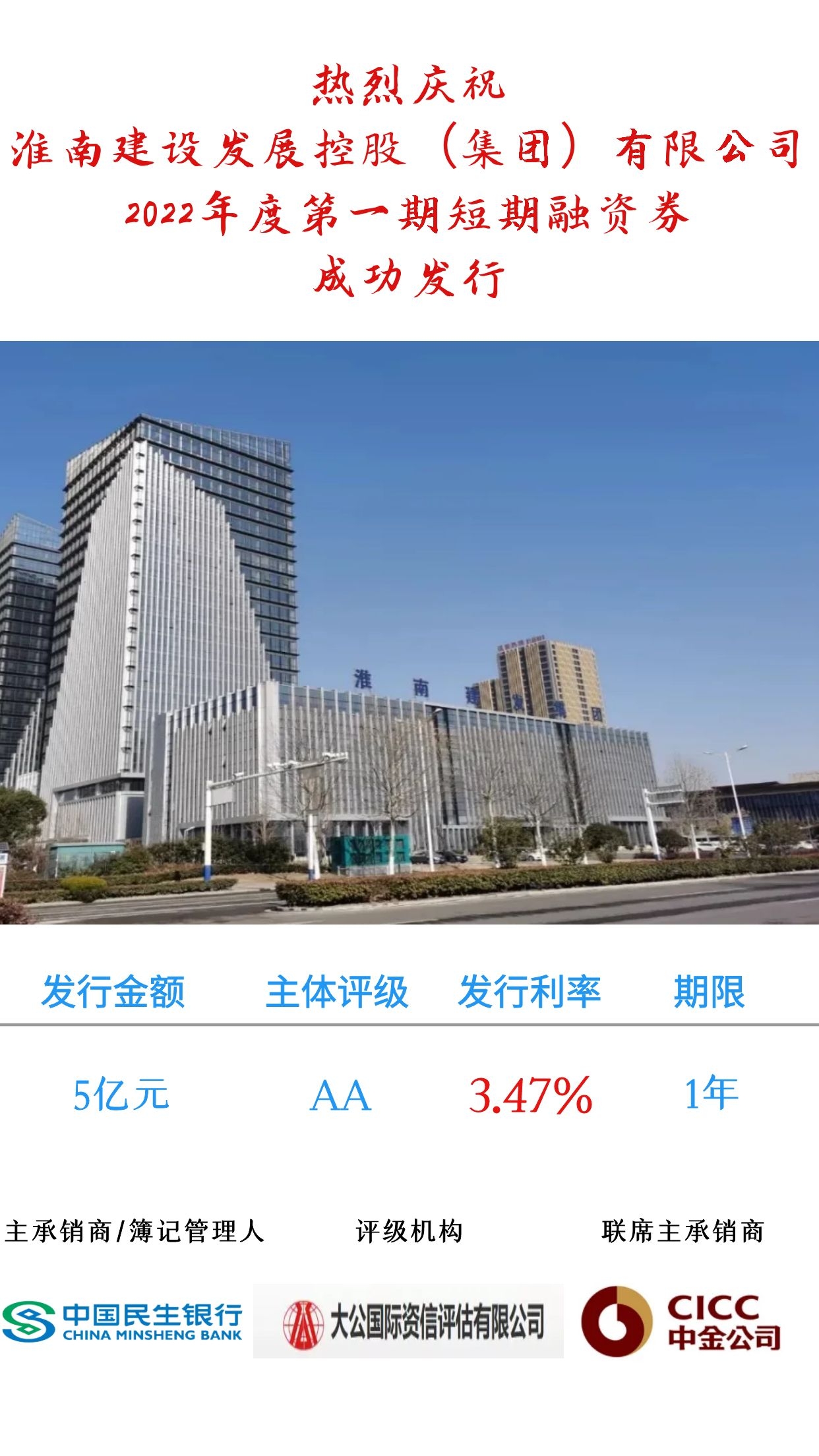 2022年3月29日,建發(fā)集團成功發(fā)行公司首筆短期融資券,債券簡稱:22淮南建發(fā)CP001、發(fā)行規(guī)模5億元、 票面利率3.47%、認購倍數(shù)達2.74倍。本期債券在主承銷商的共同努力下,在較短時間內(nèi)完成了債券注冊與發(fā)行工作。