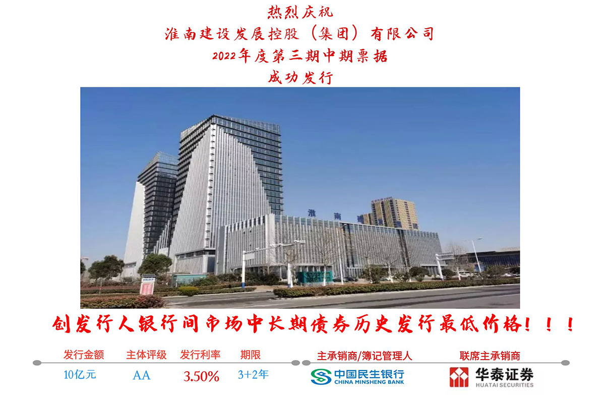 2022年7月21日,淮南建設發(fā)展控股(集團)有限公司2022年度第三期中期票據(jù)成功簿記發(fā)行,發(fā)行規(guī)模10億元。本期中期票據(jù)主承銷商為中國民生銀行,聯(lián)席主承銷商為華泰證券,簿記期間獲得眾多投資者的關(guān)注,全場認購倍數(shù)2.3倍,最終票面發(fā)行利率3.5%,創(chuàng)淮南市市屬國有企業(yè)中長期債券歷史新低。
