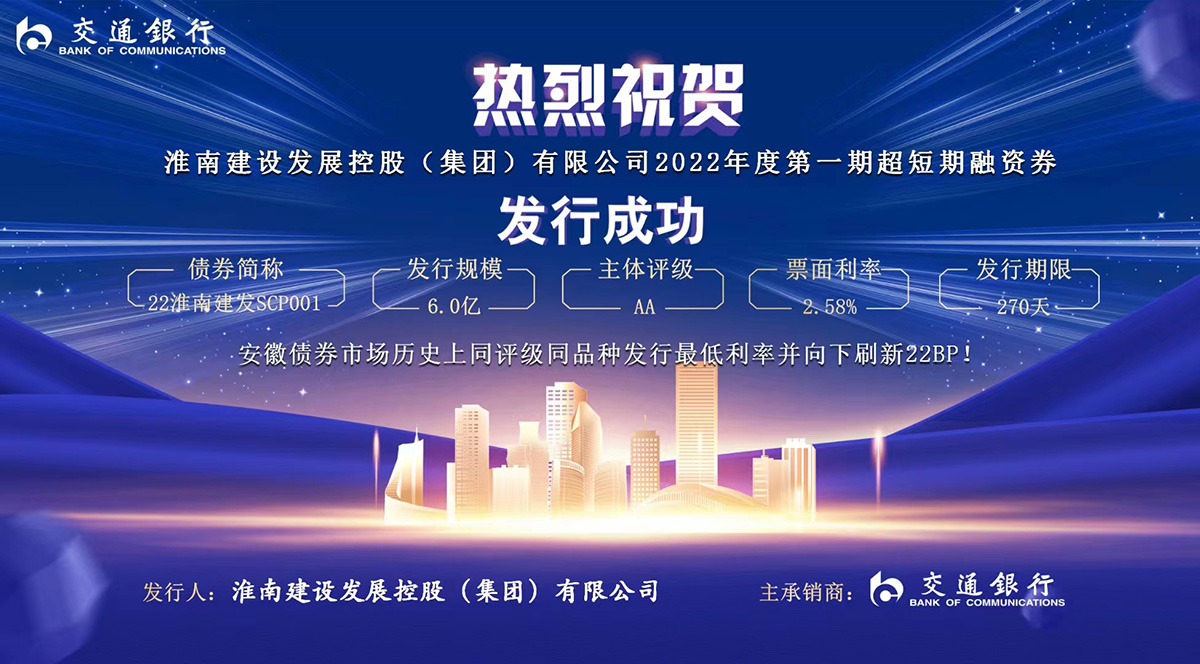 2022年7月27日,淮南建設(shè)發(fā)展控股(集團(tuán))有限公司2022年度第一期超短期融資券成功簿記發(fā)行,主承銷商為交通銀行,債券簡(jiǎn)稱:22淮南建發(fā)SCP001、發(fā)行規(guī)模6億元、票面利率2.58%,認(rèn)購(gòu)倍數(shù)3.12倍。
