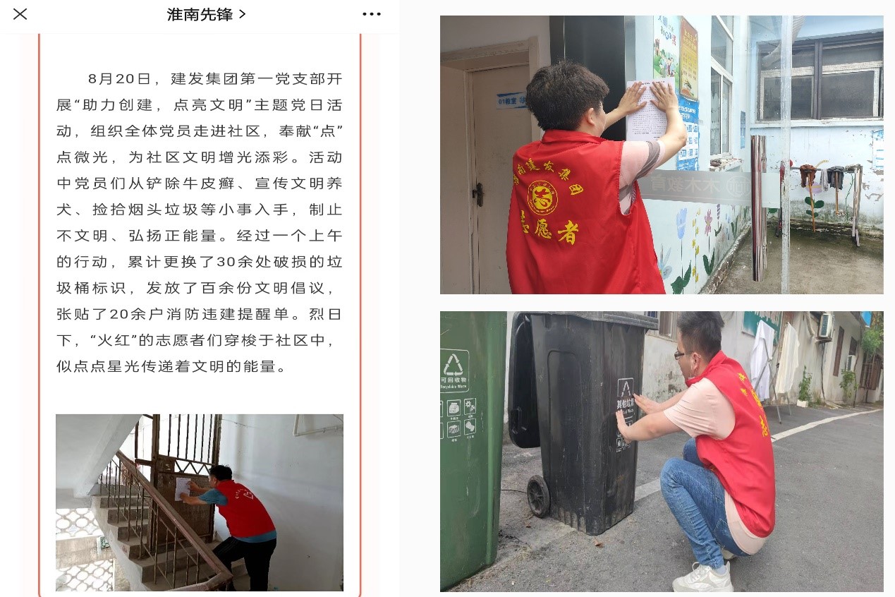 為不斷提升黨支部組織生活質(zhì)效,增強(qiáng)基層黨組織凝聚力和戰(zhàn)斗力,第一黨支部堅持把組織生活與企業(yè)發(fā)展、服務(wù)社會、城市治理等緊密結(jié)合,以“主題黨日”為重要抓手,引導(dǎo)黨員在基層一線亮身份、銘初心、擔(dān)使命,以實(shí)際行動踐行黨的宗旨,充分發(fā)揮模范帶頭作用。8月份組織開展的“助力創(chuàng)建,點(diǎn)亮文明”主題黨日活動入選了市委組織部優(yōu)秀主題黨日活動案例,在“淮南先鋒”公眾號刊登。