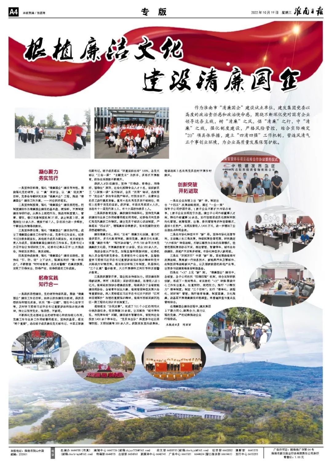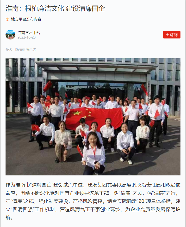 2022年10月,《淮南日?qǐng)?bào)》專版、學(xué)習(xí)強(qiáng)國刊載了集團(tuán)公司“清廉國企”建設(shè)試點(diǎn)工作情況。