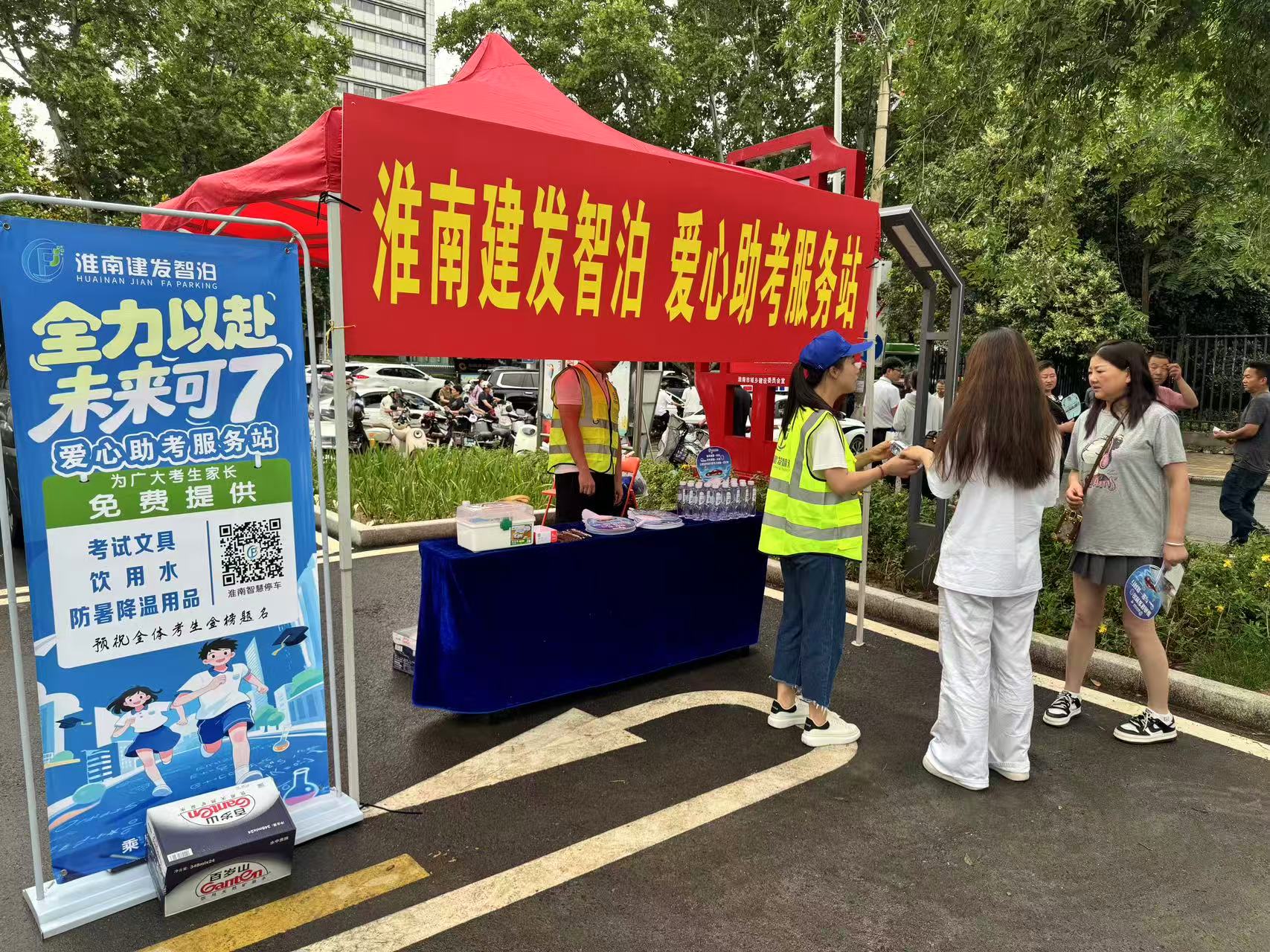 中高考期間周末,為服務考生及家長,營造溫馨、便利的應考環(huán)境,淮南建發(fā)智慧泊車管理有限公司積極履行社會責任,在淮南市第一中學及實驗中學考點周邊兩處重點停車場內,精心設立了“愛心助考服務站”。
